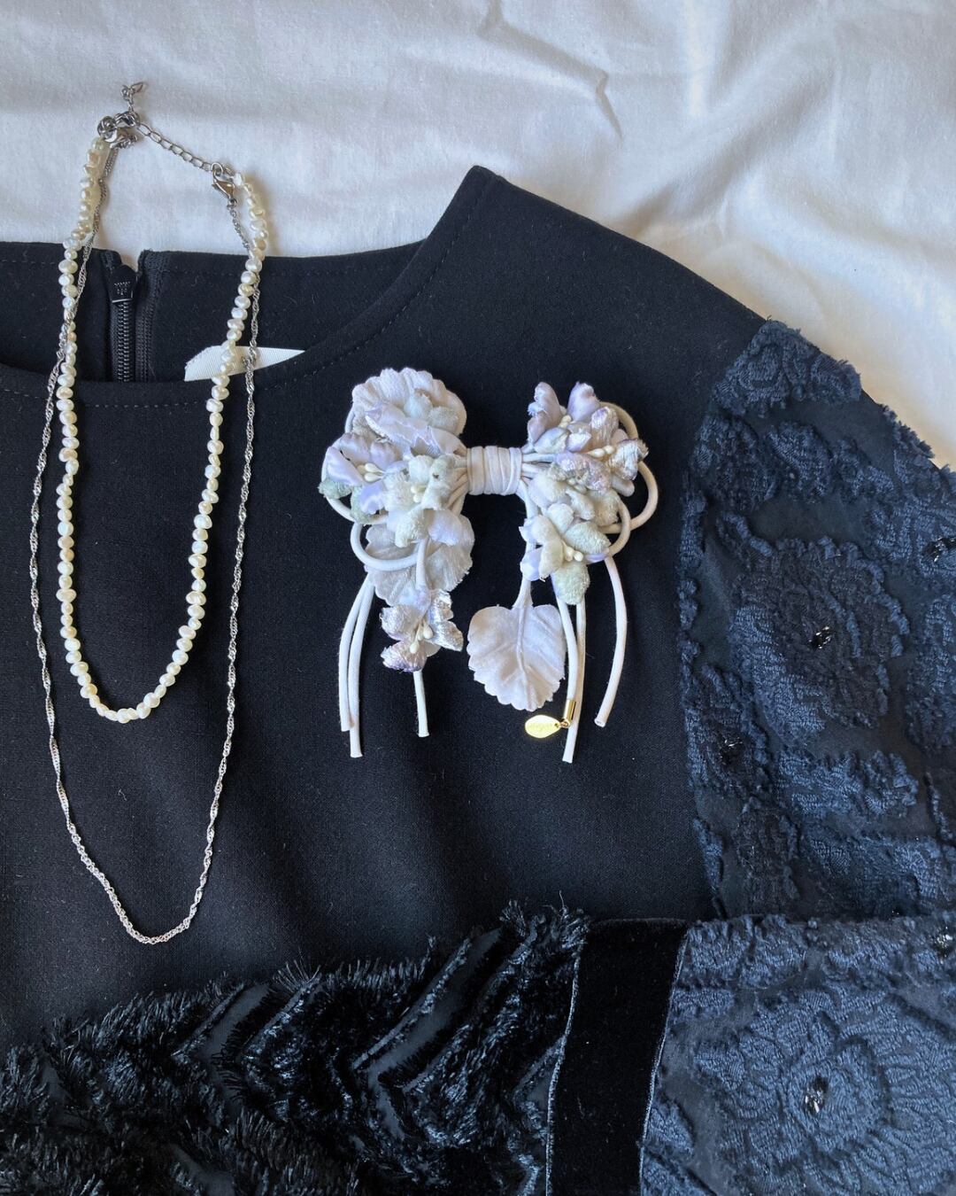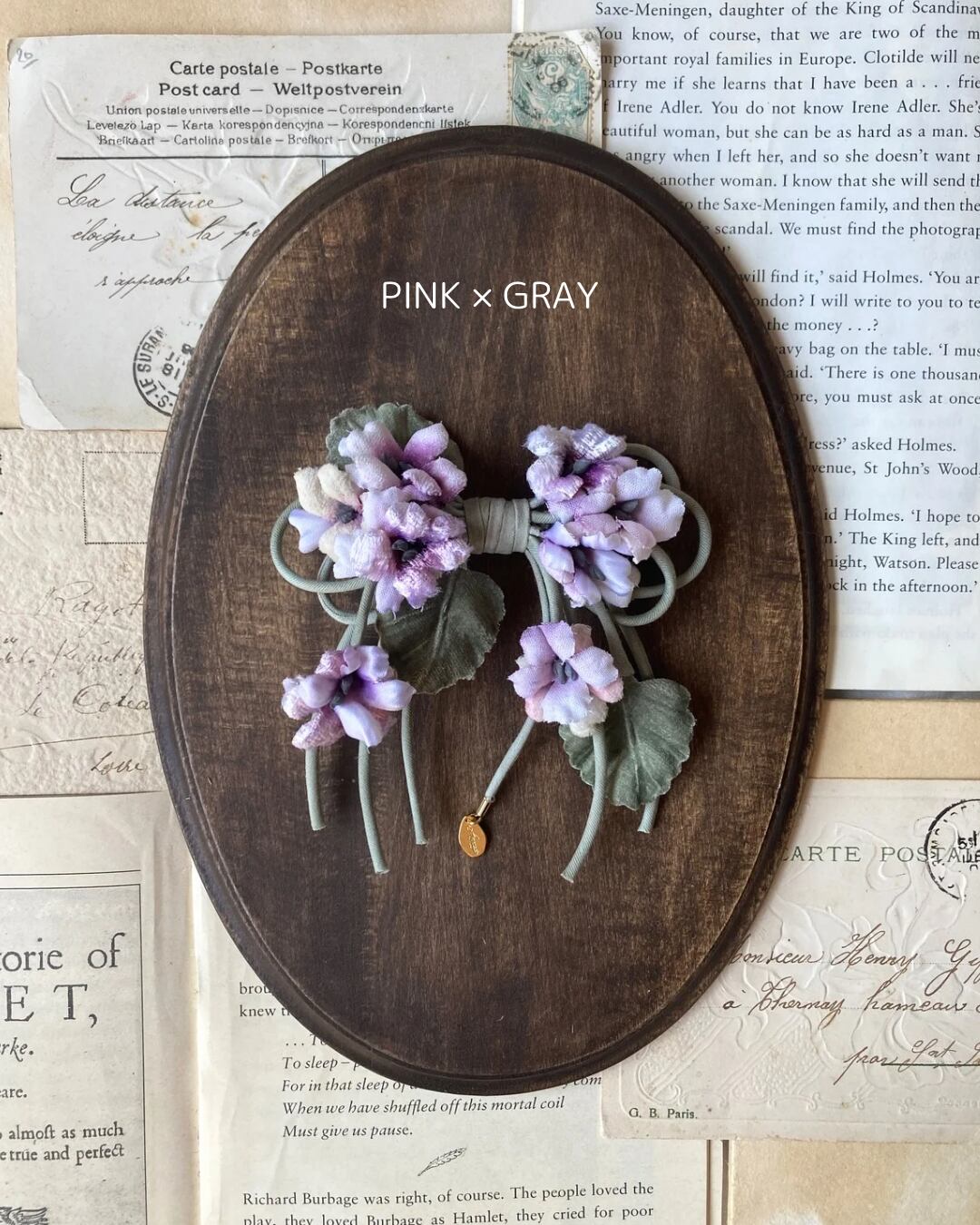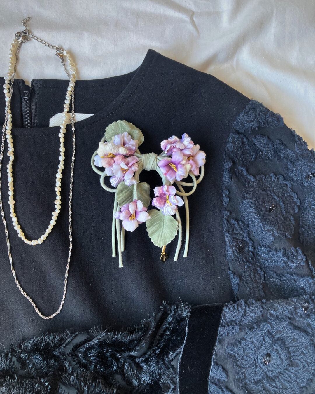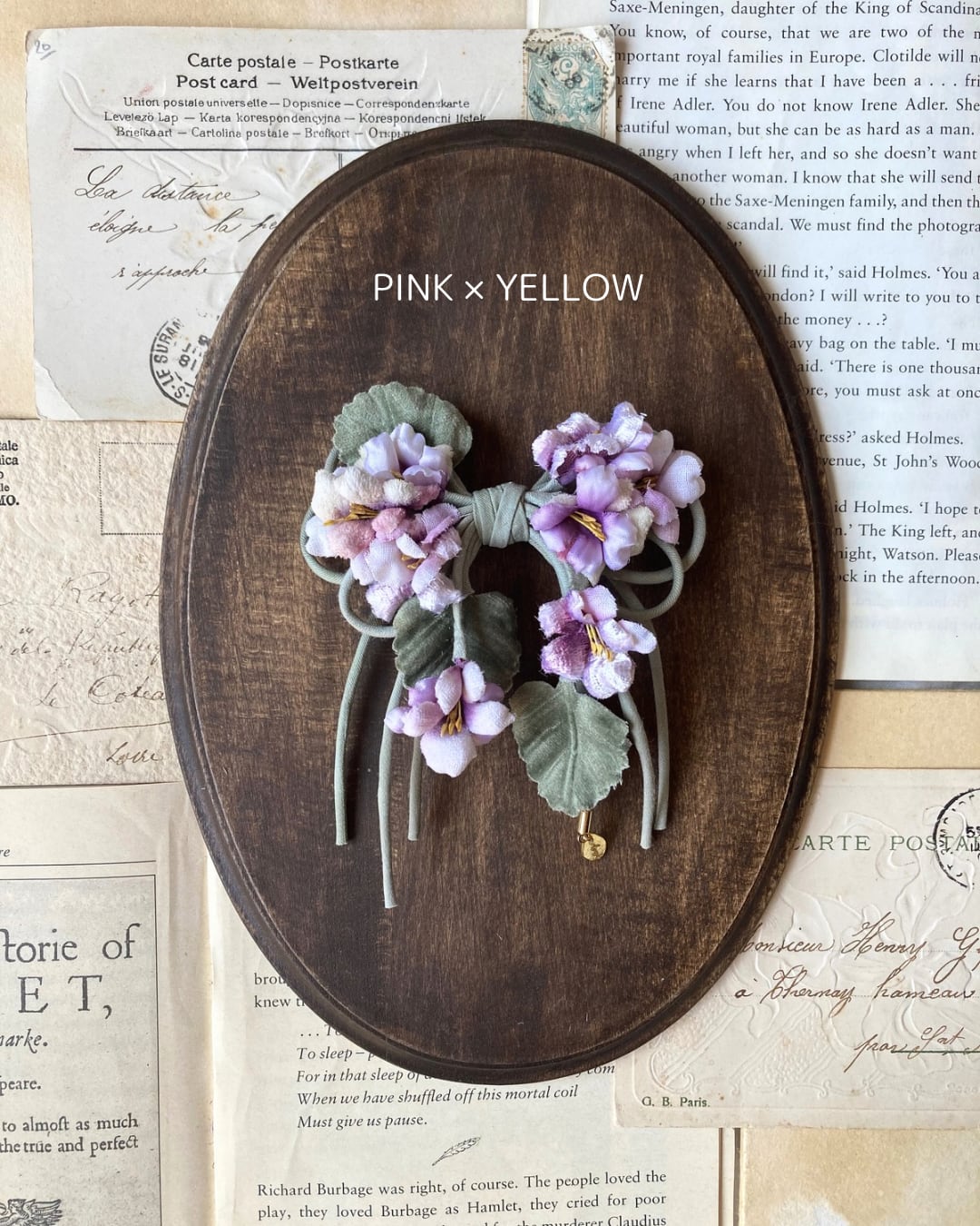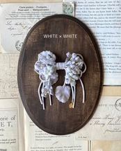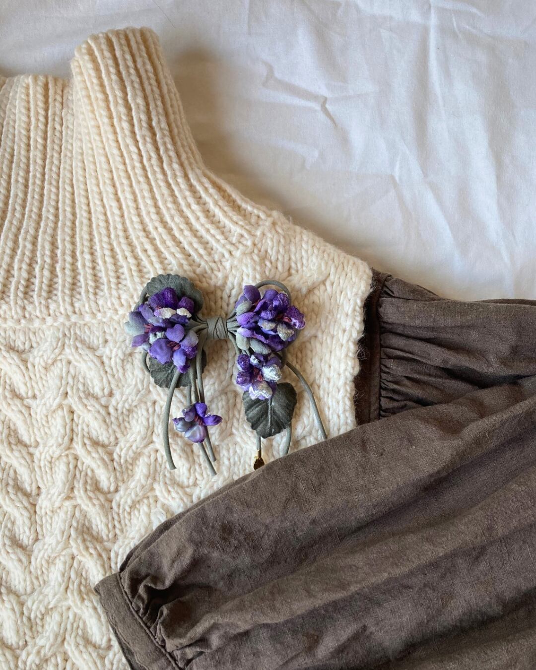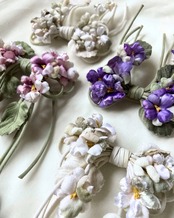 様々な生地を使ったスミレをリボンの形にアレンジしたコサージュです。