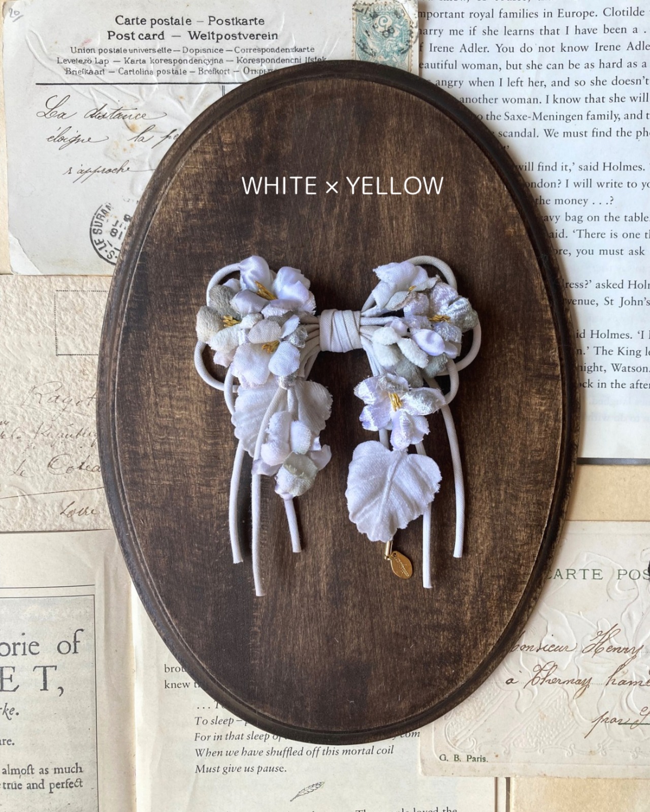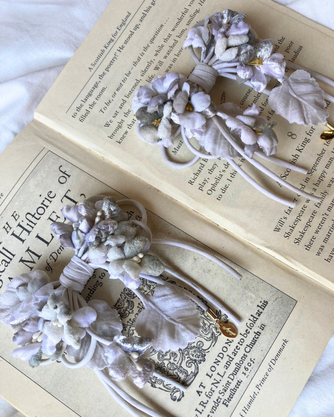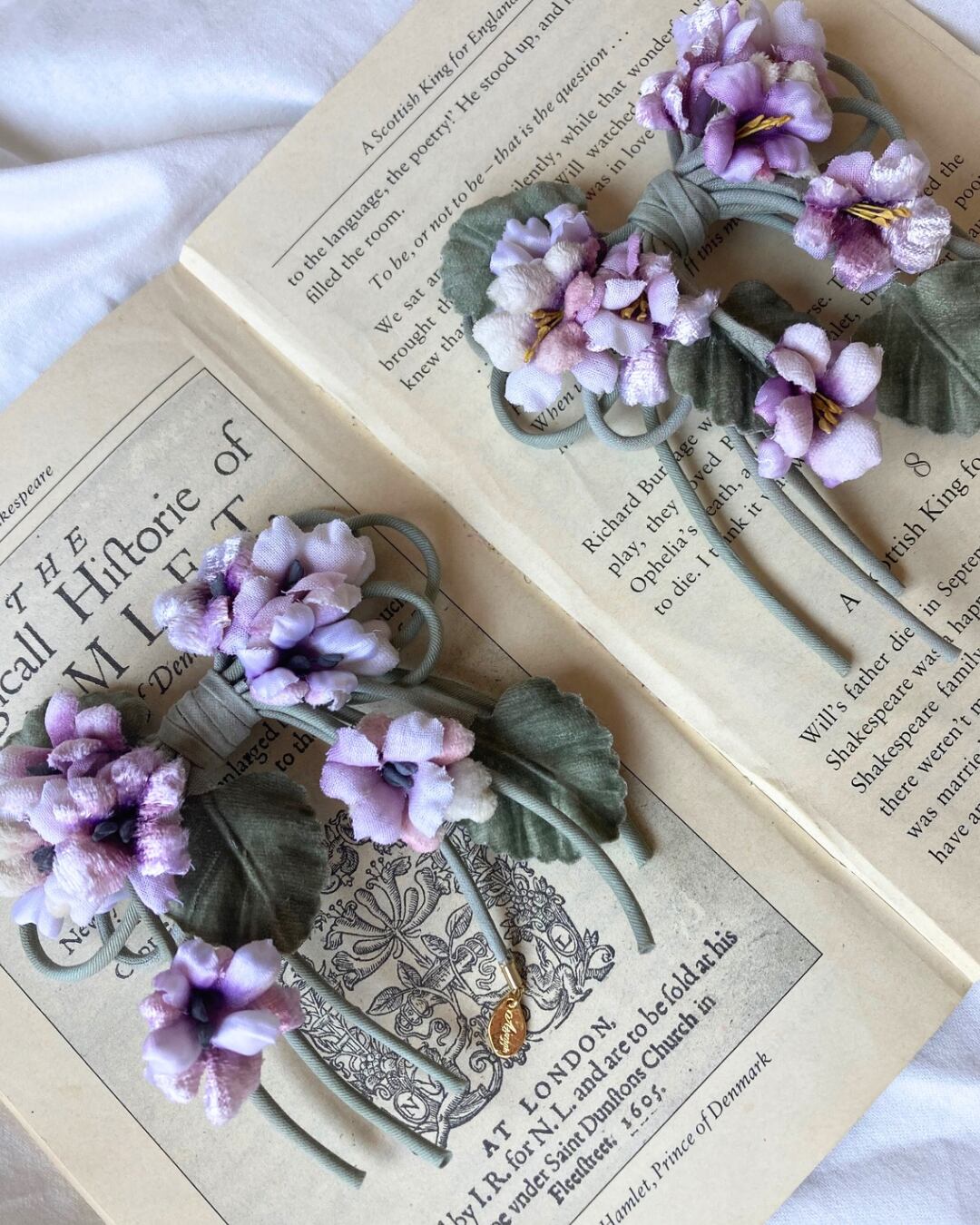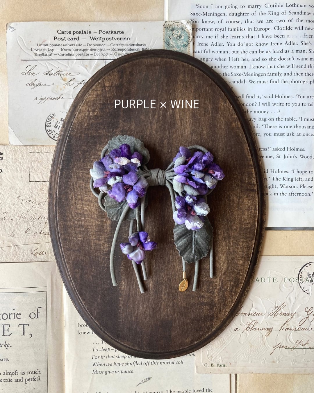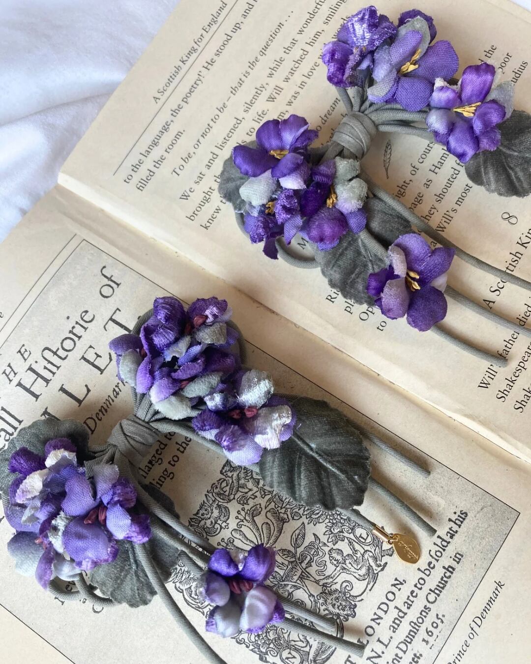 様々な生地を使ったスミレをリボンの形にアレンジしたコサージュです。