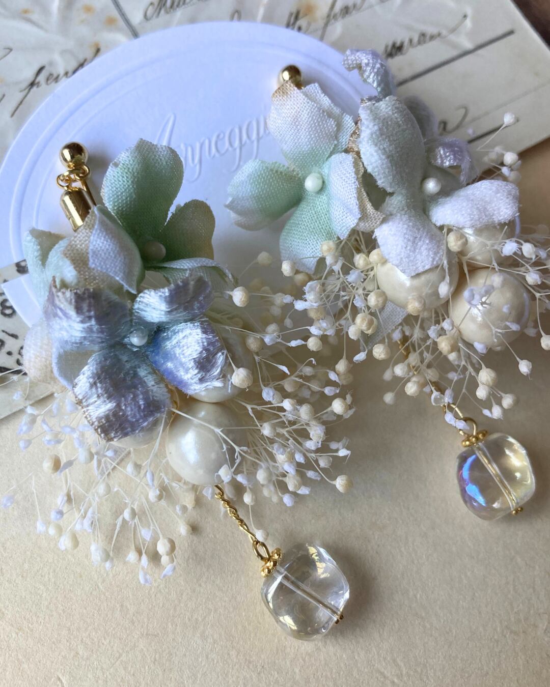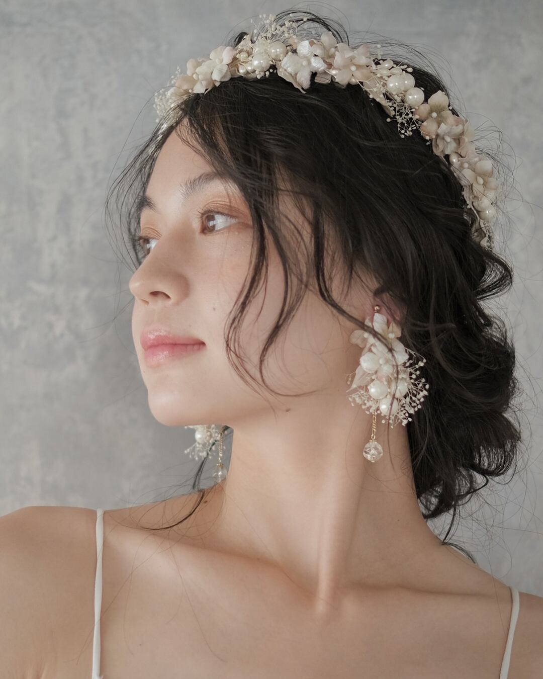 紫陽花モチーフの布花とドライフラワーを合わせてふんわりとしたボリュームのあるフェミニンなデザインです。