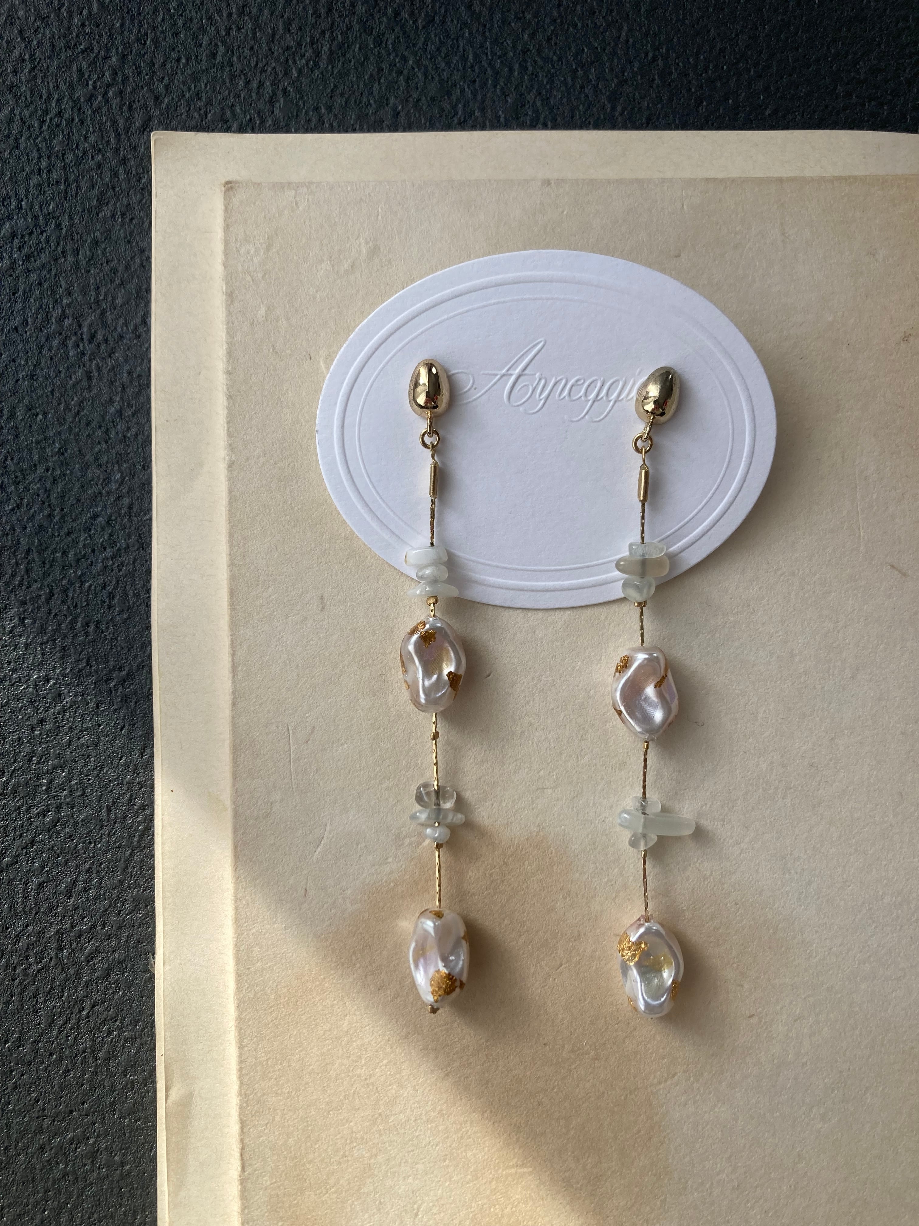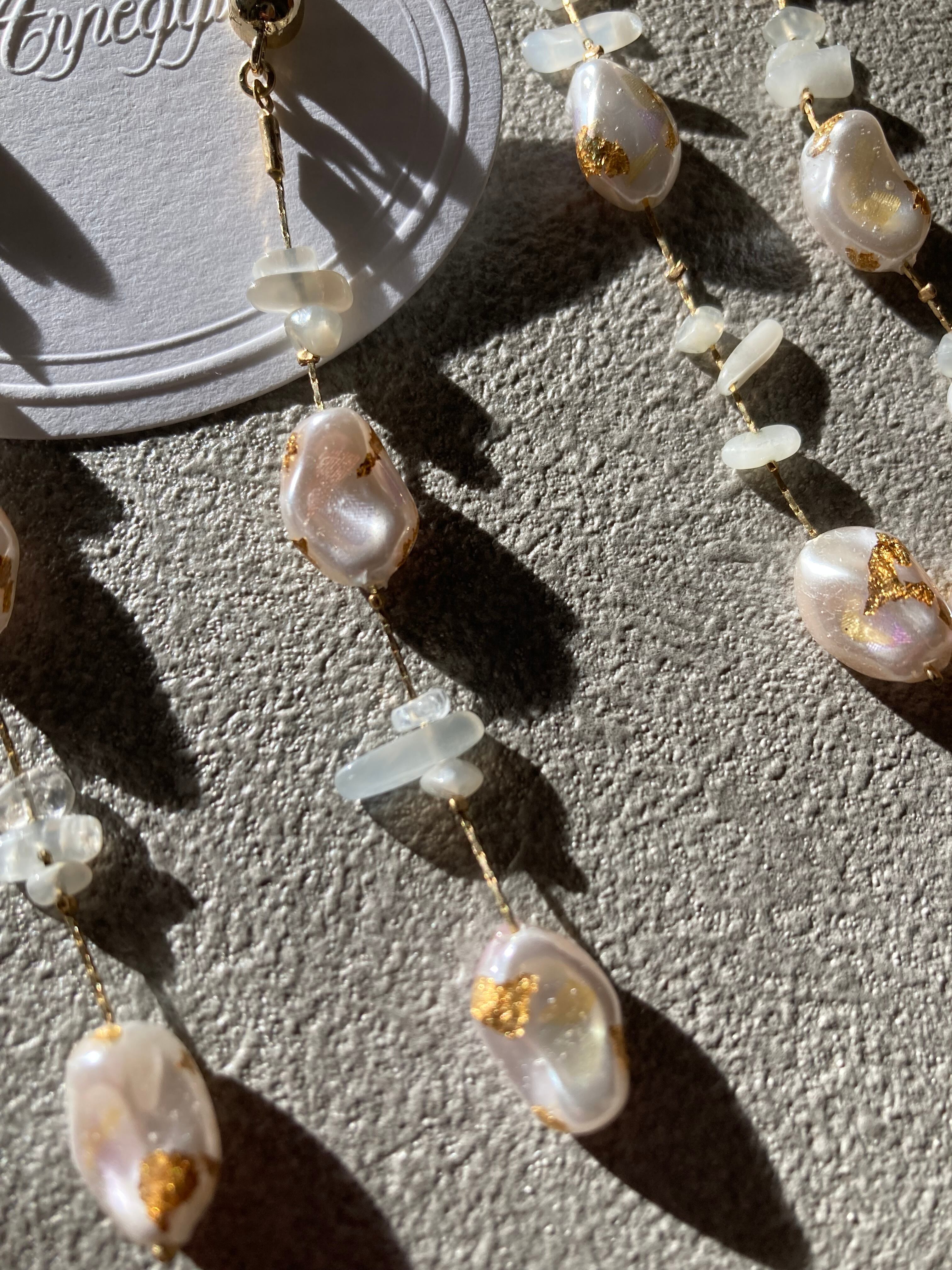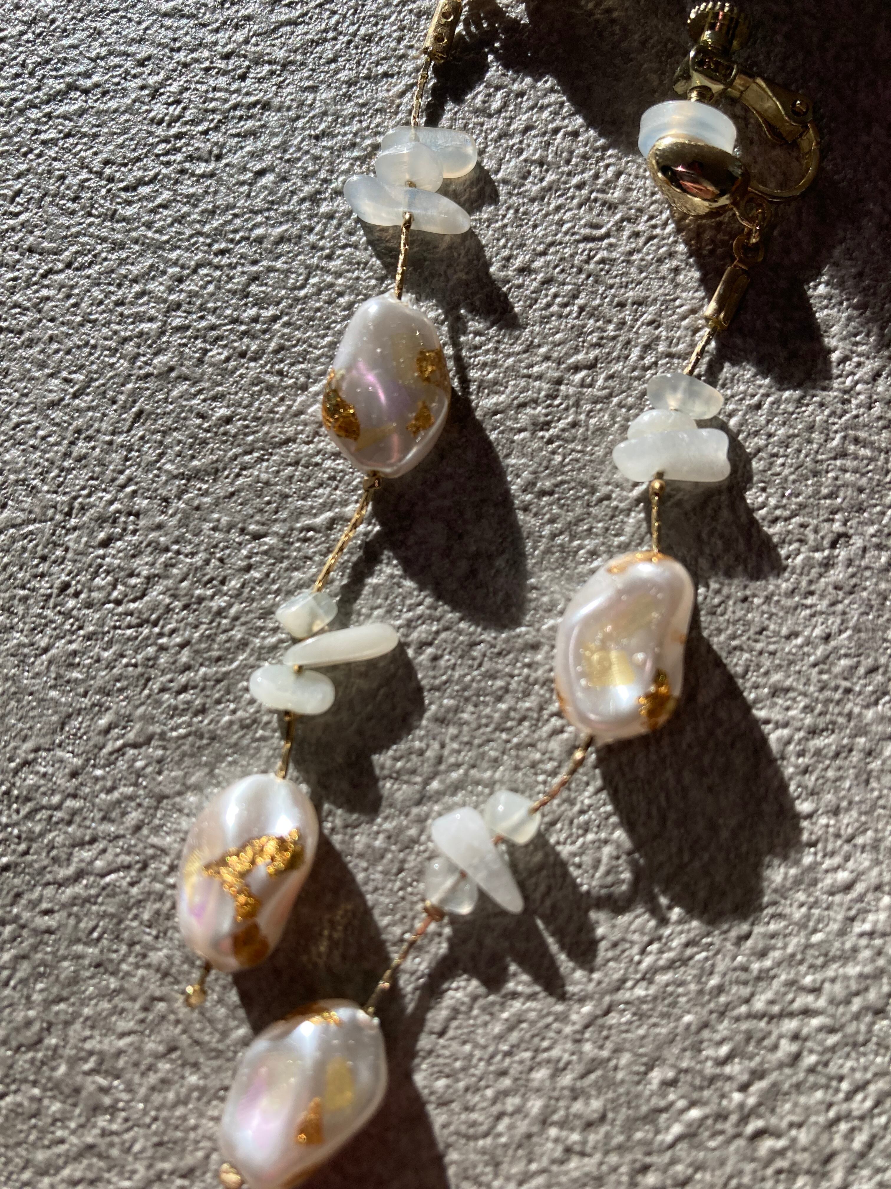 バロックパールのような、歪な形の樹脂パールに染色したシルクの欠片と金箔を閉じ込めたロングイヤリング(ピアス)。