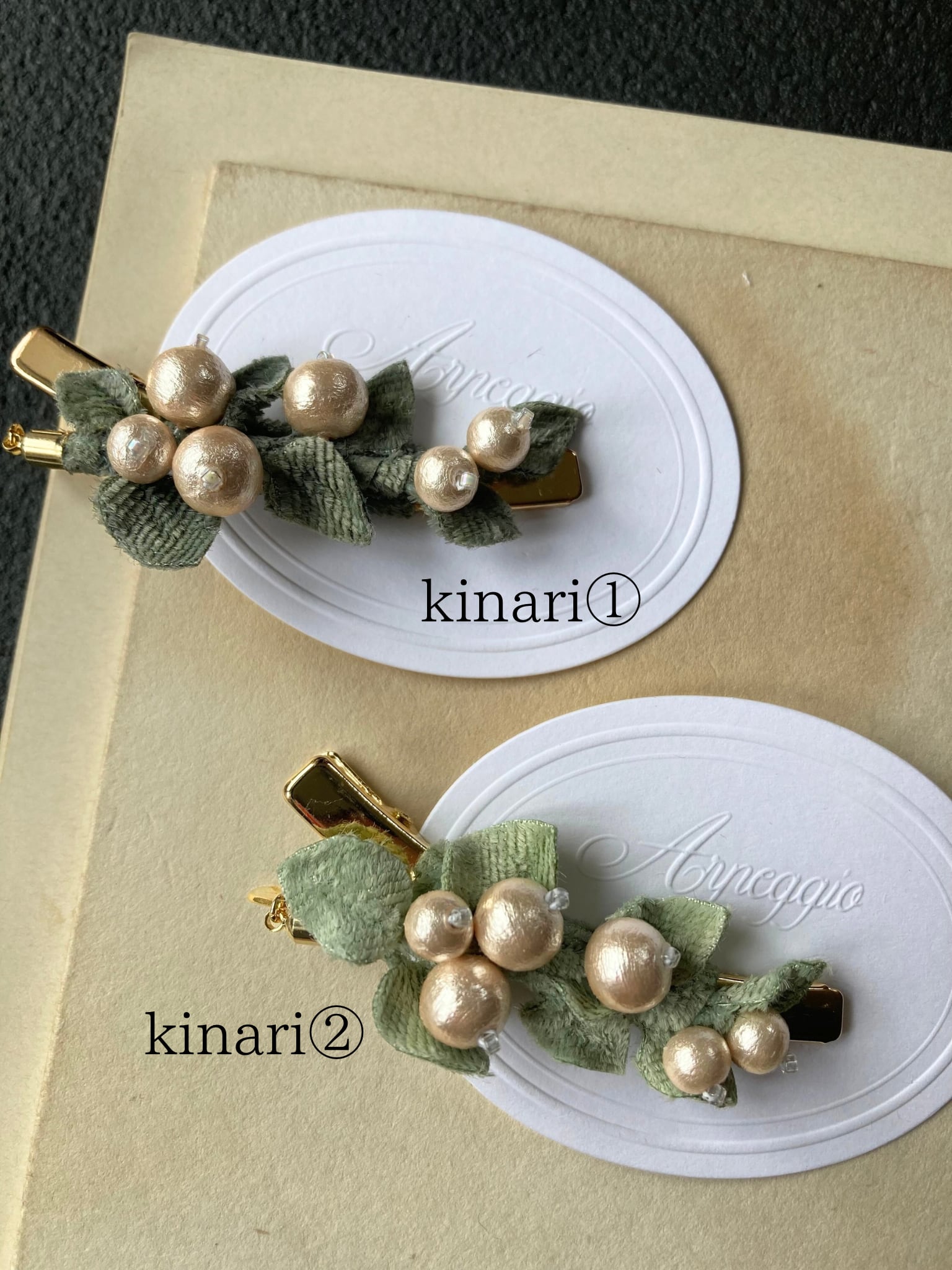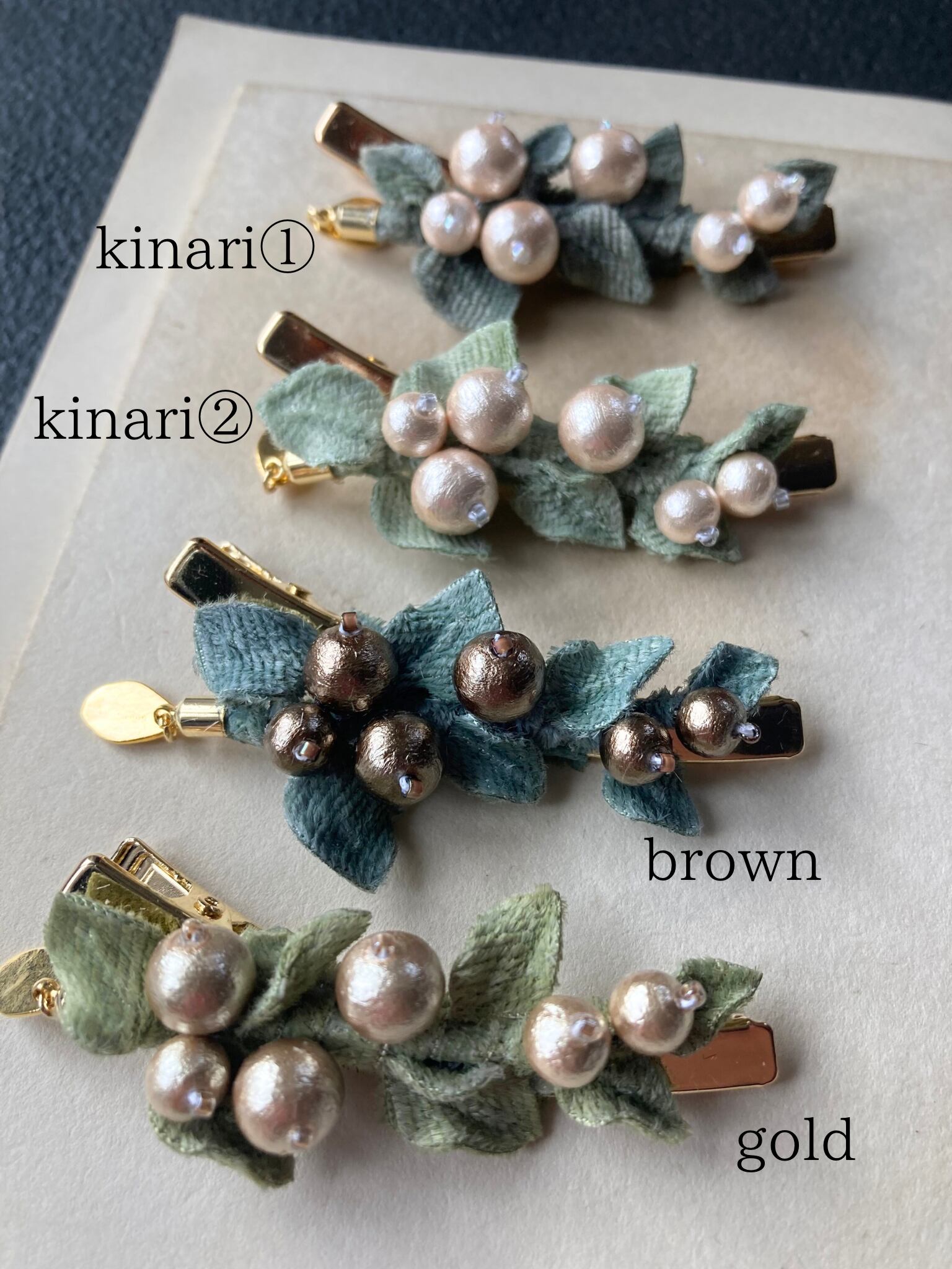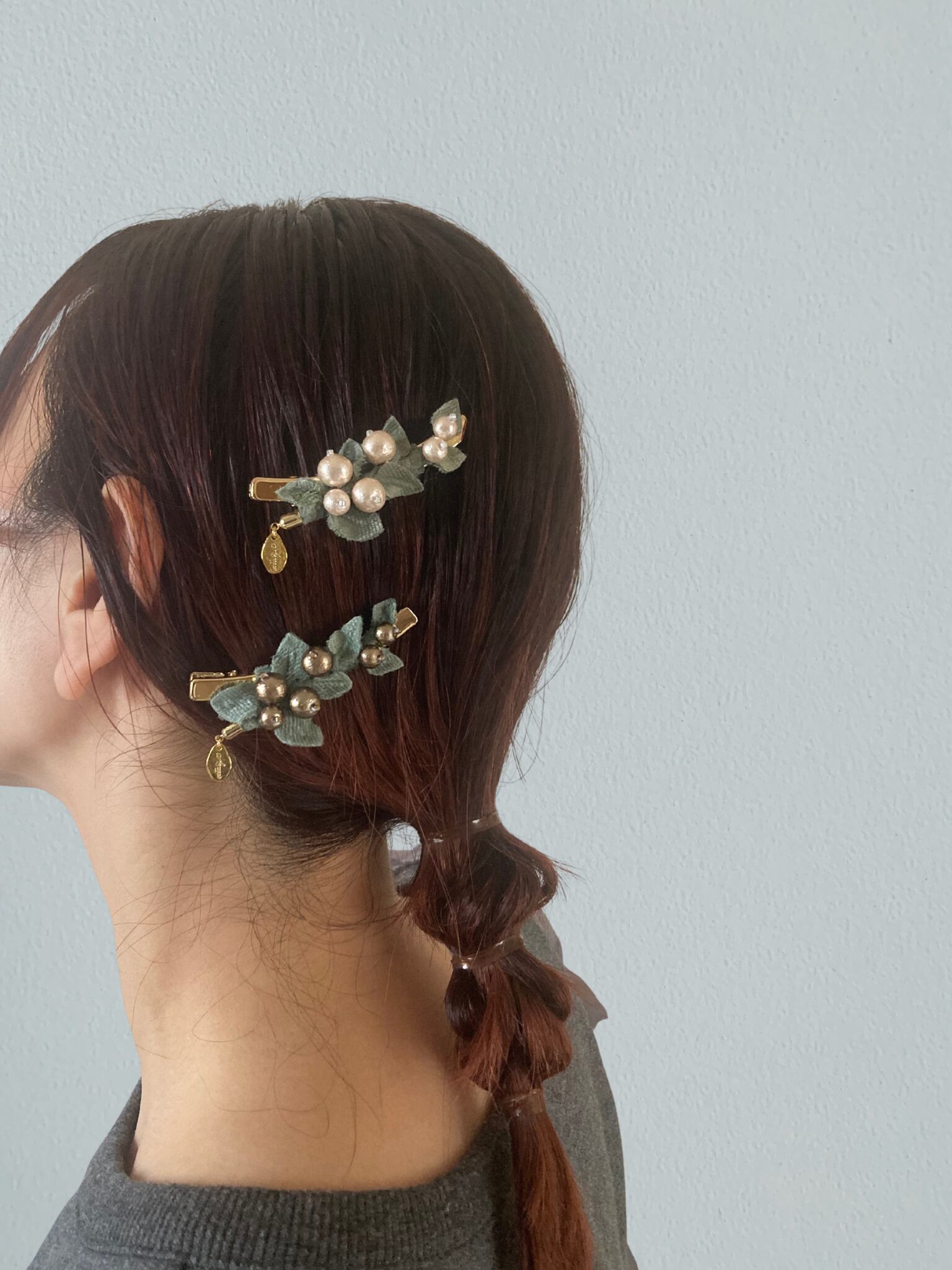 コットンパールと起毛の葉っぱを合わせたヘアクリップ。