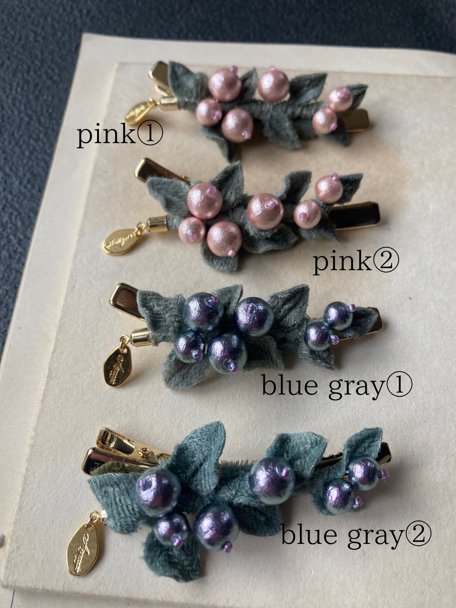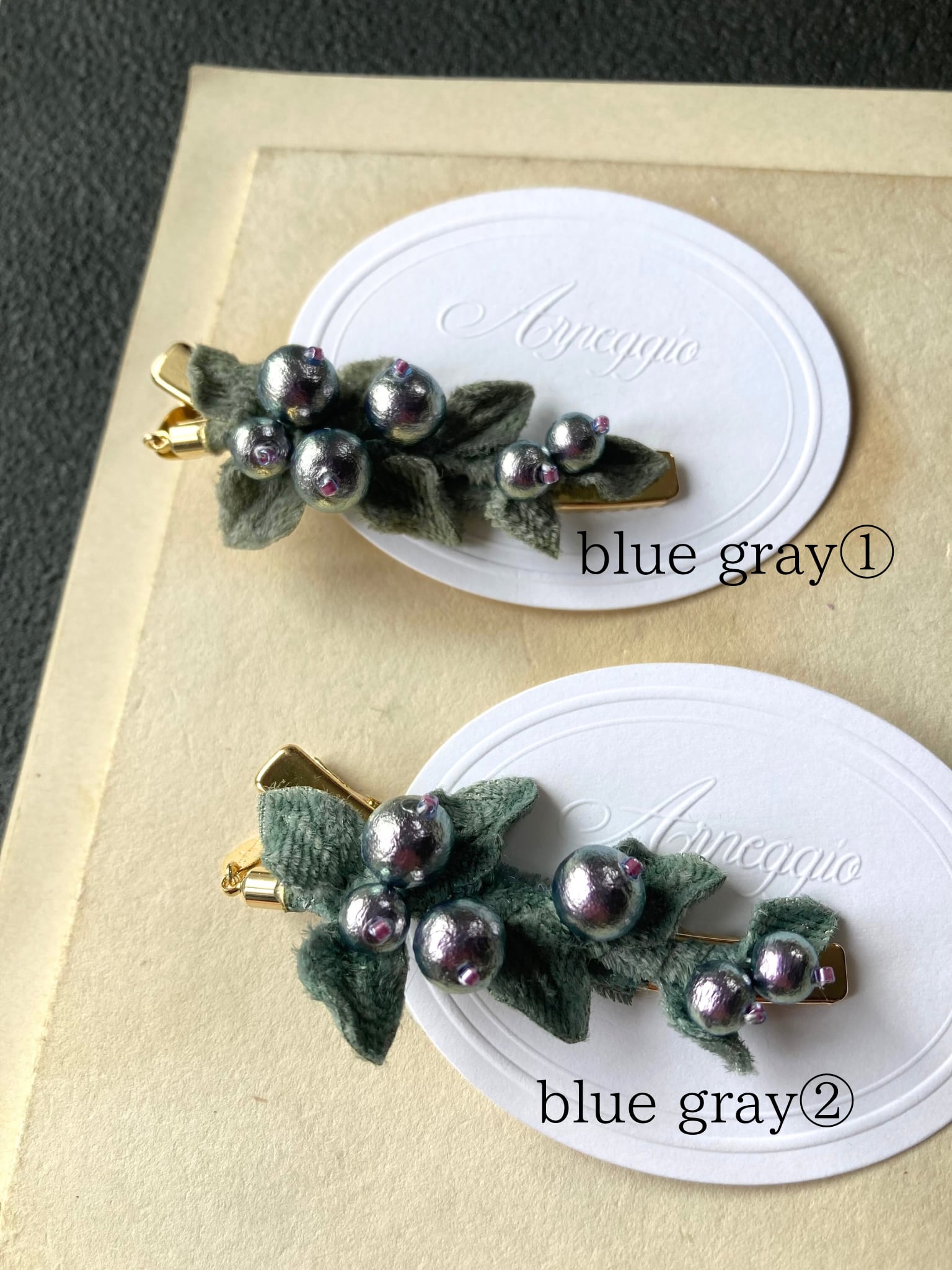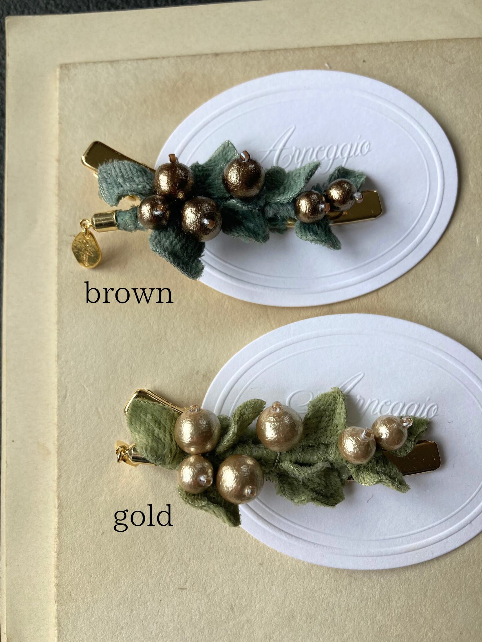 コットンパールと起毛の葉っぱを合わせたヘアクリップ。